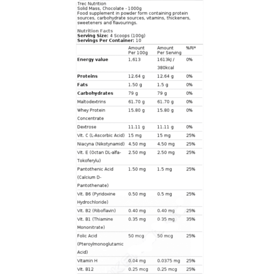 Trec Nutrition Solid Mass 5800g is a gainer, i.e., a carbohydrate and protein supplement, contributing to faster muscle mass gain. This product has been created by specialists for people who train intensely and regularly, whose aim is to increase muscle mass.
